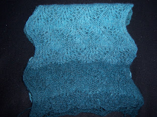 I've finally managed to finish my Japanese Feathers scarf which was nice to finally get done, seen as its been on the needles since last March! Its not as long as I probably should have done it, but I was attempting to be creative-ish, I cast on when the yarn was in a dark stripe phase and I've knitted it until its gone through the whole sequence back to dark again at the other end, it looks good, just not hugely long. Picutures are not brilliant but the light quality at the moment is just pitiful and the flash just bleeches out the lovely blues, but you'll get the idea.